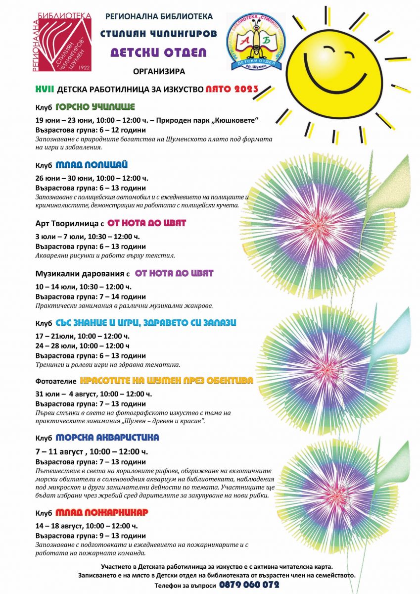 За седемнадесета поредна година Регионална библиотека „Стилиян Чилингиров” организира за шуменските деца лятна Детска работилница за изкуство със занимания в различни клубове и ателиета.