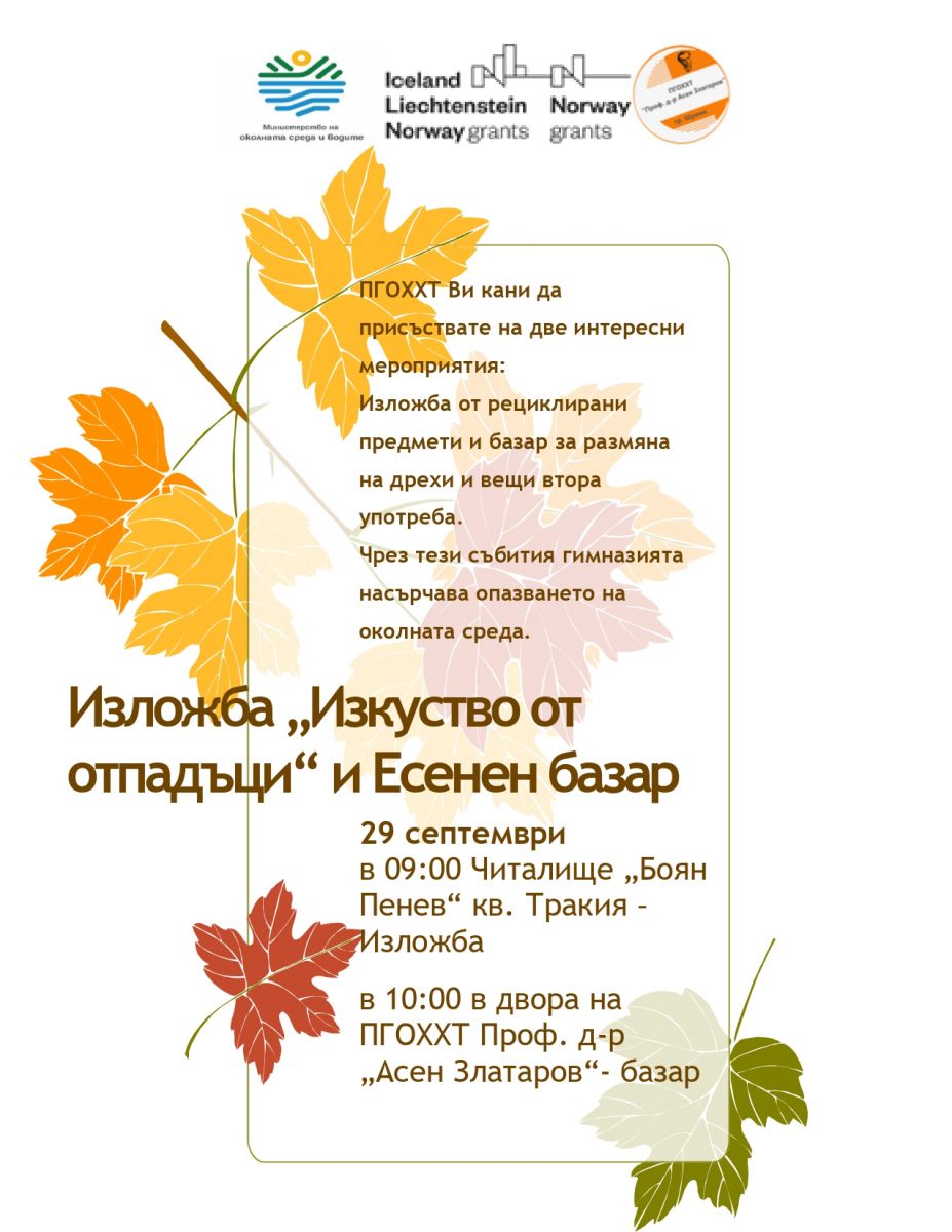 Професионална гимназия по облекло, хранене и химични технологии"Проф д-р Асен Златаров" ще организира на 29.09. 2022 г. от 10 до 16 часа - Есенен базар за размяна на дребни вещи втора употреба (книги, дрехи, игри).