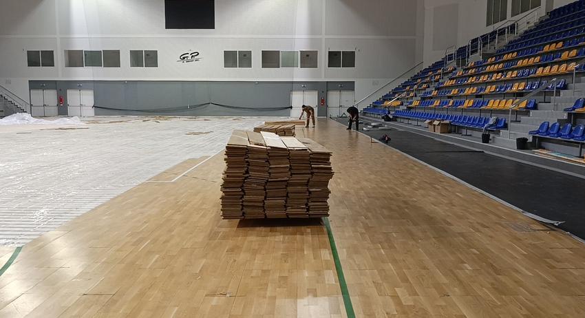 Ремонтът се предприема във връзка с проблеми по досегашната настилка, които възпрепятстваха нормалното протичане на спортните състезания и тренировъчни процеси. Към момента се демонтира старата настилка, започва демонтаж на дървените скари под нея и почистване на терена, в това число и подготовка за полагането на новата подова настилка. Дейностите се планира да продължат до средата на февруари. Изпълнител на ремонта е фирма „Ти Би Флорингс“ ЕООД.